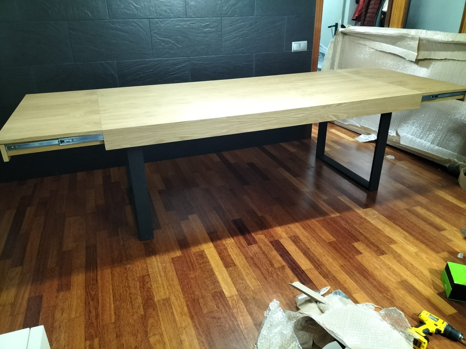 mesa de comedor 200×100 extensible 290 cm sobre roble natural patas metálicas negras
